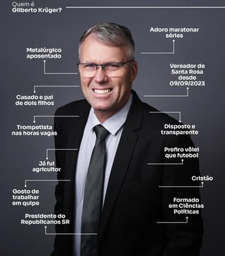 Gilberto Kruger, candidato a vereador 10000, representa a coligação Santa Rosa Cada Vez Melhor. Comprometido com a transparência e o desenvolvimento local para uma cidade melhor.